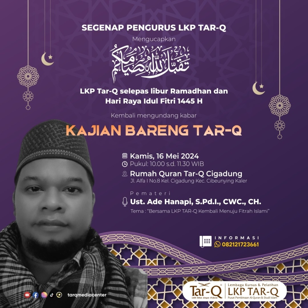 Bismillah. Bapak dan Ibu yang Allah muliakan, Rumah Quran Tar-Q Cigadung mengundang Bapak Ibu hadir dalam kegiatan Kajian Bersama LKP TAR-Q yang insyaAllah akan dilaksanakan pada : 🗓️ Hari Kamis, 16 Mei 2024 ⏰ Pukul 10:00 – 11:30 WIB 🏠 Tempat Rumah Qur’an Tar-Q Jl. Alfa 1 No. 8 Cigadung https://maps.app.goo.gl/wNSpD6cwE2qHx95k6 ✨ Bersama Ust. Ade […]